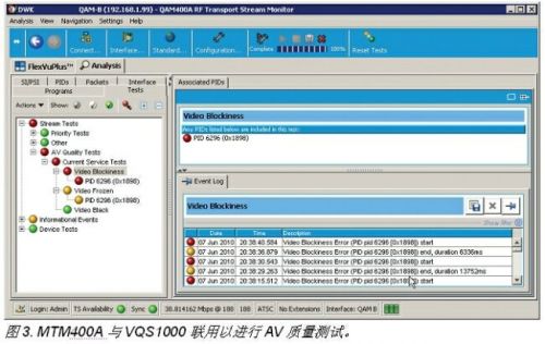 除了附加有視頻PID帶寬測(cè)量以外,VQS1000的顯示和操作幾乎與MTM400A的文件模式應(yīng)用一樣。VQS1000的另一項(xiàng)功能是當(dāng)它與MTM400A聯(lián)用時(shí),所有的觸發(fā)均通過(guò)SNMP返回到MTM400A。此外,還有一項(xiàng)測(cè)試稱為AV質(zhì)量測(cè)試也是很有用的,如圖3所示,MTM400A可以跟蹤VQS1000黑幀、凍結(jié)幀和塊效應(yīng)測(cè)量的觸發(fā)事件。