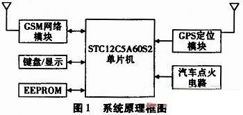 當車主離開車輛時,即可啟動防盜系統,首先車主需設置手機號,以備接收車輛的定位信息,此時,單片機控制GPS模塊,不斷獲取GPS定位數據,并對獲取的GPS數據進行分析,從而獲取包括車輛的經、緯度以及速度等信息。系統通過車輛的速度或經、緯度的變化來判斷車輛是否被移動,如果車輛被非法移動,單片機將控制GSM模塊將車輛的定位信息通過短消息,以每間隔十分鐘時間發送到車主指定的手機中,同時,單片機將此信息存儲在EEPROM中,以做將來的證據使用。車主第一時間知道車輛位置后,即可通過GSM遠程網絡控制防盜系統,切斷車輛的點火電路,使車輛熄火。同時,車主將車輛定位信息提供給警方,盡快找回自己的車輛。系統工作原理框圖見圖1。