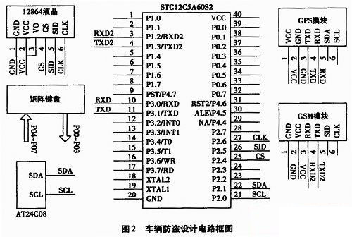 人機接口包括矩陣鍵盤和液晶顯示部分,主要用于實現預置的手機號碼的輸入、顯示和防盜功能的開啟與關閉功能。存儲器采用HC總線的EEPROM AT24C08,其為非易失性存儲器,存儲的數據可保存100年以上,并可進行上萬次擦寫。單片機將GPS上接收來的數據進行解析后,所獲得的車輛所處的經、緯度,速度等信息保存在該存儲器中,為以后做為公安機關的證據依據。