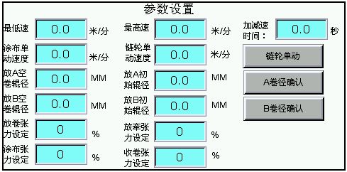主畫面反映了全部傳動(dòng)軸的運(yùn)行狀態(tài)、當(dāng)前放卷卷徑、線速度,以及各個(gè)擺桿的張力角度位置等,如圖3所示。參數(shù)設(shè)置界面提供了一些工藝參數(shù)數(shù)據(jù)等,如圖4所示。