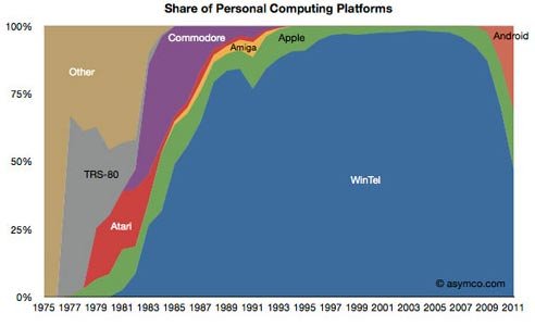 美國市場調(diào)研公司Asymco分析師賀拉斯·德迪歐(Horace Dediu)發(fā)布報告稱,傳統(tǒng)x86架構(gòu)Windows PC(Wintel)在全球個人計算設(shè)備中的份額已經(jīng)降至50%左右。在1995年至2005年期間,Wintel曾幾近完全壟斷個人計算設(shè)備。