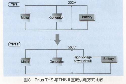 在THS中,蓄電池通過逆變器直接與電機和發電機相連(見圖8);而THSⅡ中,蓄電池組輸出的電壓首先通過DC—DC升壓變換器進行升壓操作,然后再與逆變器相連,因此逆變器的直流母線電壓從原THS的220V提升為現在的500V。