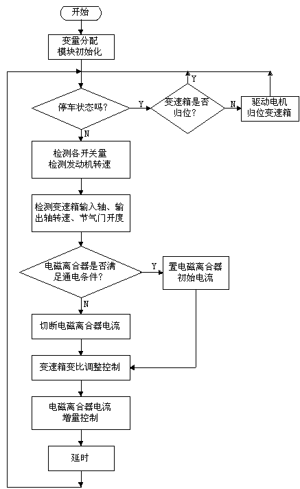 TCU控制系統(tǒng)主程序框圖如圖3所示。程序首先對內(nèi)部RAM進(jìn)行分配,然后對各功能模塊如Administrator/D轉(zhuǎn)換器、定時器、PWM波形發(fā)生器等進(jìn)行初始化。變速箱的變比在汽車每次時應(yīng)處于最小變比的位置,因此在每次停車時應(yīng)將變速箱歸位,汽車起動后首先檢測各參數(shù),如檔位開關(guān)、發(fā)動機(jī)轉(zhuǎn)速、節(jié)氣門開度、變速箱輸入、輸出軸轉(zhuǎn)速等。這些參數(shù)是控制電磁離合器電流和電動機(jī)狀態(tài)的依據(jù)。當(dāng)需要增加變速箱的變比時,TCU控制電機(jī)正轉(zhuǎn),反之控制電機(jī)反轉(zhuǎn)。電磁離合器的控制采用電流增量控制方式。它的控制好壞,直接影響汽車運(yùn)行的平穩(wěn)性和經(jīng)濟(jì)性。