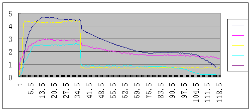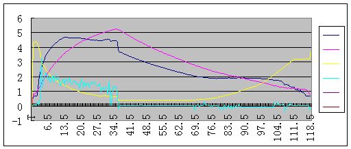 圖5為汽車速度從零加到120KM/H后又由120KM/H減到零時,位置傳感器與輸入軸轉(zhuǎn)速、輸出軸轉(zhuǎn)速和電機(jī)電壓之間的關(guān)系曲線。由圖可知,當(dāng)汽車速度在從零加到120KM/H過程中,位置傳感器變比由最大開始下調(diào)直到變?yōu)樽钚。藭r對應(yīng)電機(jī)反轉(zhuǎn)。當(dāng)車速由120KM/H開始下降時位置傳感器先保持不變,此時電機(jī)不轉(zhuǎn),同時輸入軸轉(zhuǎn)速和輸出轉(zhuǎn)速成比例的下降,當(dāng)車速達(dá)到一定的值時位置傳感器速比由最小開始上調(diào)直到為最大值,此時電機(jī)反轉(zhuǎn)(因測試時采用的電流傳感器為單方向的,所以圖中沒有反映出反向電流)。輸入軸轉(zhuǎn)速和輸出軸轉(zhuǎn)速不成比例的下降直至為零。從圖5可以看到車速在上升時,位置傳感器速比的測試值不斷地減小(對應(yīng)的轉(zhuǎn)速比增大)。反之,車速在下降的過程中,當(dāng)車速小于某一值時測試值增加。從而實現(xiàn)了變速箱變比的自動調(diào)整。