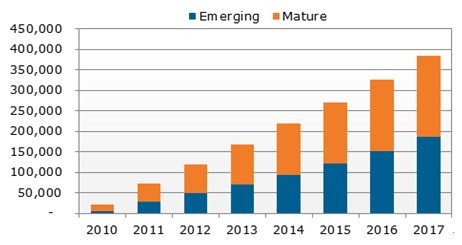 圖一、2010-2017平板電腦按新興市場與成熟市場出貨量(單位:千臺)