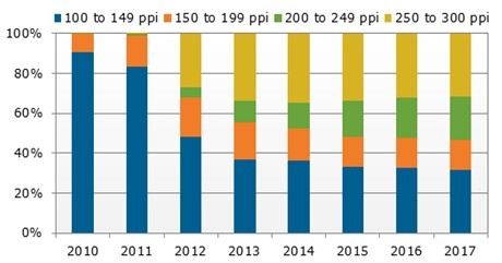 隨著市場發展,平板電腦本身規格也不斷地的進步。更高的像素將使平板電腦將具有理想多媒體體驗。在接下來幾個季度,面板的分辨率和像素將進一步提高;我們預估,2012年200-300ppi像素的滲透率將達30%,到了2017年可達到47.5%。