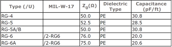 一般在測量高頻電路的時候,我們通常采用RF同軸線,比如常見的RG-58C,從直覺來看,50ohm的RF同軸線不會對測量引起太大的影響,可是如果從實際來思考,傳輸線可以看做是一系列LCRG組成的網絡,由于CL的存在,這個網絡必然存在一個工作頻率范圍,由于RG的存在,這個網絡必然存在損耗,所以傳輸線會對測試系統產生濾波器效應,也就是說傳輸線也有一個工作頻率范圍的問題,如果我們用網絡分析儀去測試一根RF同軸線比如RG-58C,在很寬的頻率范圍來掃描其S21,我們會發現這個同軸線是一個低通濾波器,從RF線材的非理想性來看,這個測量結果應該是意料之中的。可以設想,如果我們單純讓這根同軸線工作在遠離其低通濾波器corner-frequency很遠的地方,那么從RF匹配的角度來看,這個同軸線就不是一個50ohm或者75ohm匹配的同軸線,如果使用這根線,必然引起很大的反射損耗,此時就必須重新選擇其他RF線材。下面的表格就是一個RF同軸線的參數表格,可以看到每個feet長度時,其等效的電容大約是20~30pF,對于高頻而言,這個是比較大的電容,這就是為什么我們在進行RF測量時,必須選擇盡可能短的同軸線的原因。
