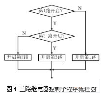 下面是系統(tǒng)中幾個子程序的流程圖:三路繼電器控制子程序流程圖如圖4。