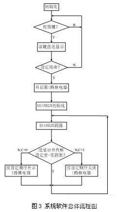 系統(tǒng)軟件總體流程圖如圖3所示。系統(tǒng)上電后,首先進(jìn)行初始化,對寄存器和I/O端口進(jìn)行設(shè)置。當(dāng)檢測到按鍵有效信號,讀取按鍵數(shù)據(jù),傳遞給單片機(jī)并送顯示模塊顯示,鍵盤設(shè)定結(jié)束后置標(biāo)志位,單片機(jī)檢測到此信號后,開啟第1路繼電器進(jìn)行加熱。此時初始化數(shù)字溫度計DS18B20進(jìn)行溫度測量,并將測得實(shí)時溫度數(shù)據(jù)送單片機(jī)處理,再由顯示模塊顯示。DS18B20每測完一次溫度后,就將實(shí)測溫度值與設(shè)定溫度值的上限和下限進(jìn)行比較,如實(shí)測溫度高于設(shè)定溫度的上限,轉(zhuǎn)到繼電器關(guān)閉處理程序,檢測每一路繼電器的開、關(guān)狀態(tài),按照第3路、第2路、第1路的順序關(guān)閉繼電器(每執(zhí)行1次關(guān)閉1路繼電器);如實(shí)測溫度低于設(shè)定溫度的下限,轉(zhuǎn)到繼電器開啟處理程序,檢測每一路繼電器的開、關(guān)狀態(tài),按照第1路、第2路、第3路的順序開啟繼電器(每執(zhí)行1次開啟1路繼電器)。在之后的系統(tǒng)工作中始終循環(huán)測溫~溫度值比較~開啟或者關(guān)閉繼電器這樣的流程,以達(dá)到對加熱區(qū)域溫度恒溫控制的目的。