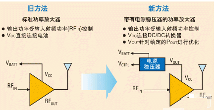 使用DC-DC轉換器(功率放大器電源穩壓器)的主要目的是減少分母中的Pdc因子。當功率放大器與電池直接相連時,Pdc=Vbatt*Ibatt,而當它使用功率放大器電源穩壓器供電時,Pdc=V o*I o。現在我們能夠看出,為了增加PAE,V o和Io 必須低于Vbatt和Ibatt。這可以通過降低發射的射頻功率電平,降低功率放大器電源穩壓器的輸出電壓來實現。這樣也降低了Io (功率放大器的吸收電流),并且由于DC-DC轉換器的高效性,電池的輸出電流也會降低。