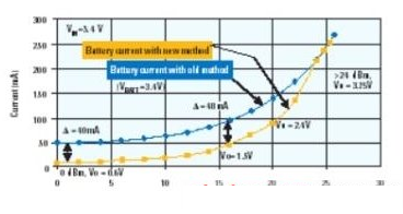 圖3:當功率放大器使用DC-DC轉換器供電時,電池電流的節省情況