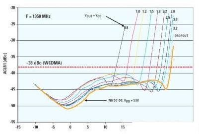 那么,當發射功率電平提高時,我們為什么必須改變DC-DC轉換器的電壓呢?答案是:這種改變是保持鄰道功率抑制比(ACPR)的需要。ACPR用于表示功率放大器的失真狀況和其他子系統或系統引起鄰信道干擾的趨向。它指的是主信道的功率譜密度(PSD)與在幾種不同的失調頻率下測量的功率譜密度的比值。