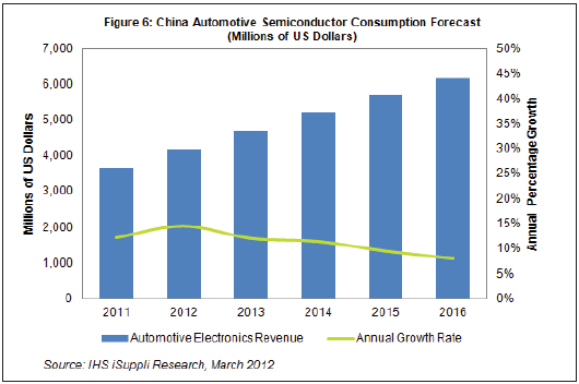在幾個關鍵因素的推動下,中國汽車半導體消費2016年以前的復合年度增長率將達11%。
