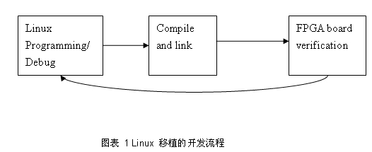 使用者開始進行Linux移植到晶心平臺,首先須先選定一版晶心的Linux原始碼作為基準再進行軟件移植,修改原始碼以符合使用者的開發平臺,經由工具鏈的compile與link所產生的Linux的映像文件,再放到FPGA板上以驗證程序編寫的正確與否,依此開發程序:軟件編寫->FPGA板驗證,再回到軟件編寫程序直到所有周邊IP在FPGA板上驗證完全,Linux 移植才完成,如圖表 1所示,Linux移植過程中,AICE調試可以有效加快Linux移植的速度。