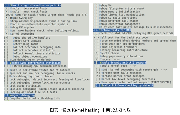 Linux Kernel 需要設定一些調試選項,才能順利的運用AndeSoft™的GDB進行調試。晶心平臺中Linux kernel 調試選項設定如圖表4所示,增加這些選項會增加kernel 映像文件的空間,如果空間占用過大以至于不符合設計需求時,可在調試工作完畢后將調試選項關閉以節約不必要的空間浪費。