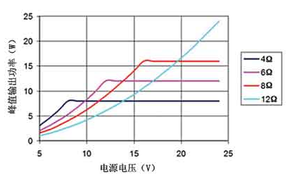 D 類放大器MOSFET輸出級(jí)的導(dǎo)通電阻會(huì)影響它的效率和峰值電流能力。降低負(fù)載的峰值電流可減少M(fèi)OSFET的I2R損耗,進(jìn)而提高效率。要降低峰值電流,應(yīng)在保證輸出功率, D類放大器的電壓擺幅以及電源電壓的限制的條件下,選擇最大阻抗的揚(yáng)聲器,如圖4所示。本例中,假設(shè)D類放大器的輸出電流為2A,電源電壓范圍為 5~24V。電源電壓大于等于8V時(shí),4Ω的負(fù)載電流將達(dá)到2A,相應(yīng)的最大連續(xù)輸出功率為8W。如果8W的輸出功率能滿足要求,則可以考慮使用一個(gè) 12Ω揚(yáng)聲器和15V供電電壓,此時(shí)的峰值電流限制在1.25A,對應(yīng)的最大連續(xù)輸出功率為9.4W。此外,12Ω負(fù)載的工作效率要比4Ω負(fù)載的高出 10%~15%。實(shí)際效率的提高根據(jù)不同D類放大器而異。雖然大多數(shù)揚(yáng)聲器的阻抗都采用4Ω或8Ω,但也可采用其他阻抗的揚(yáng)聲器實(shí)現(xiàn)更高效的散熱。