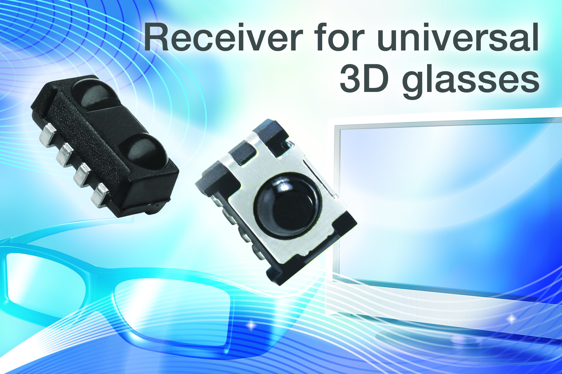 現(xiàn)在市場(chǎng)上出售的大多數(shù)液晶3D電視都在使用快門(mén)式眼鏡,將左眼和右眼的圖像分開(kāi)。盡管人們做了很多努力,試圖將用來(lái)同步3D電視與相應(yīng)的主動(dòng)快門(mén)式眼鏡的技術(shù)實(shí)現(xiàn)標(biāo)準(zhǔn)化,但業(yè)界離這個(gè)目標(biāo)還相當(dāng)遙遠(yuǎn),各個(gè)制造商提出了大量互不兼容的紅外和射頻協(xié)議。標(biāo)準(zhǔn)的缺失催生了“通用3D電視機(jī)眼鏡”市場(chǎng),這種眼鏡能夠與任何使用主動(dòng)眼鏡技術(shù)的3D電視配合工作。新的TSMP6000和TSMP77000是表面貼裝紅外接收器,可接收任何用于3D電視同步的紅外信號(hào),簡(jiǎn)化了通用3D電視眼鏡的設(shè)計(jì)工作。