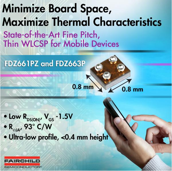 便攜設備的設計人員面臨著在終端應用中節省空間、提高效率和應對散熱問題的挑戰。為了順應這一趨勢,飛兆半導體公司(Fairchild Semiconductor)開發了FDZ661PZ和FDZ663P P溝道、1.5V規格的PowerTrench®薄型0.8mm x 0.8mm WL-CSP MOSFET器件。