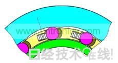 圖3:踩下離合器的狀態(tài)。向左旋轉(zhuǎn)保持器時,滾柱會向圓頂較低位置移動,進入由內(nèi)輪與外輪相夾而成的楔形空間。