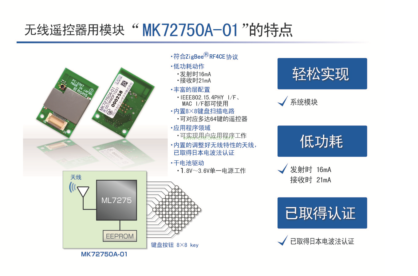 針對這種情況,LAPIS Semiconductor開發出2.4GHz無線通信模塊“MK72750A-01”,此模塊符合“ZigBee®RF4CE”協議,并且可通過內置的調整好無線特性的天線立即發射電波。另外,此模塊作為無線通信LSI,由于內置了本公司生產的“ML7275”,因此僅此模塊可以實現ML7275著稱的低功耗且符合RF4CE規范的無線遙控器功能。本產品內置調整好無線特性的天線,已取得日本國內電波法認證,所以,無線技術開發經驗較少的客戶也可開始輕松開發。在日本國內,可以立即發射電波進行評價、開發,因而開發周期亦可大大縮短。另外,使用了本公司設計的無線通信LSI,LSI相關事項可提供迅速、精準的技術支持。