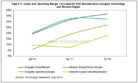 第一季度希捷的毛利率達(dá)到36.9%,高于去年第四季度時的31.6%,以及去年第三季度時的19.3%。泰國洪災(zāi)發(fā)生在去年第三季度。希捷的營業(yè)利潤率上升幅度更大,從去年第四季度的18.9%跳增至27.2%,如圖1所示。