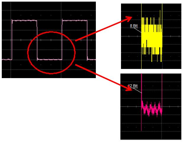 ADC位數對垂直分辨率有多大影響?我們來看下圖,這是用8bit示波器和12bit示波器分別對同一個信號采集后,對其中部分波形放大顯示的結果。