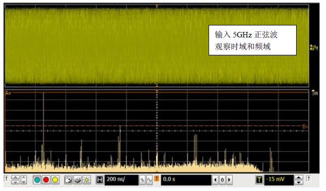 垂直分辨率還和示波器本身的噪聲和失真水平有關。打個比方,一臺高分辨率的電視機,如果它內部電路噪聲很大,導致屏幕出現很多雪花點。即便是高清片源也會被這些雪花點給模糊了。同樣道理,示波器ADC能夠分辨的最小電壓也可能淹沒在示波器的噪聲中。如何評估示波器的噪聲水平呢?有的示波器廠家喜歡用基底噪聲(noise floor):示波器不輸入信號,測量基線的噪聲大小。這種指標只能作為參考。因為沒有人使用示波器時不輸入信號。有無輸入信號,示波器內部電路的工作狀態可能差別很大。下面兩圖是某示波器沒有輸入信號和輸入一個高信噪比的5GHz正弦波的對比圖,并分別對時域波形做FFT,觀察頻域。在沒有信號輸入時,頻域噪底比較平坦,而輸入正弦波后,除了信號基頻和諧波分量以外,出現不少雜散,而且噪底的形狀也不再平坦。因此基線噪聲不是評估示波器噪聲水平的合理指標。