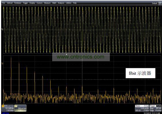 可以看出8bit示波器采集的波形出現臺階狀現象,這是因為信號的微小變化和ADC量化誤差相當,信號的微小變化淹沒在了量化噪聲中。可能很多工程師使用示波器時并沒有注意到這個現象。好比兩臺尺寸相同、分辨率不一樣的電視機,站在5米外觀看可能看不出差別,靠近了觀察就能發現低分辨率電視機的像素點更粗、馬賽克現象更明顯。那么把示波器捕獲的信號放大、觀察細節,也就有類似的效果。