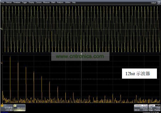 力科HRO不僅ADC位數比其他實時示波器高,也有極低的噪聲水平。典型的信噪比為55dB。而8bit示波器一般只有35~40dB。下圖是將一個多諧波信號分別輸入到8bit和12bit示波器,轉化到頻域觀察。兩者頻域的垂直刻度和基準都一樣,可以看出,12bit示波器的頻域噪底比8bit示波器低大約10dB