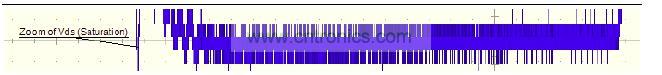 我們來看一個實際的測試案例:需要對某開關電源產品中的功率MOS管進行分析。其中有一個測試項是MOS管導通損耗。分別用電壓和電流探頭測量漏源電壓Vds與漏極電流Ids,在示波器上將兩個波形相乘得到功率波形,導通期間的功率就是導通損耗。由于在導通期間,Vds與Ids的值都很小,和8bit示波器的量化誤差相當。可以將Vds波形導通時的波形放大觀察,也會出現前文提到的臺階狀現象: