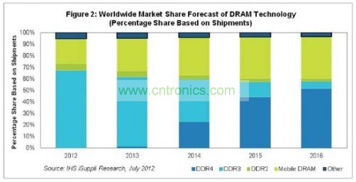 考慮到2011年出貨量為零,今年出貨量預計只占總體DRAM領域的1.4%,DDR4在2014年以前不會達到很大的規模。但DDR4市場兩年后將迅速增長,2014年市場份額將增至23.1%,超過目前占主導地位的DDR3。