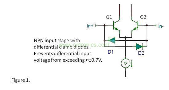 許多運(yùn)算放大器都在輸入端之間有電壓鉗位,其大多數(shù)一般都使用背靠背二極管(有時(shí)使用兩個(gè)或者更多的串聯(lián)二極管)來實(shí)施。這些二極管保護(hù)輸入晶體管免受其基極結(jié)點(diǎn)反向擊穿的損害。差動(dòng)輸入為約6V 時(shí)便會(huì)出現(xiàn)許多IC 工藝擊穿,這會(huì)極大地改變或者損壞晶體管。下圖顯示了NPN 輸入級(jí),D1 和D2 提供了這種保護(hù)功能。