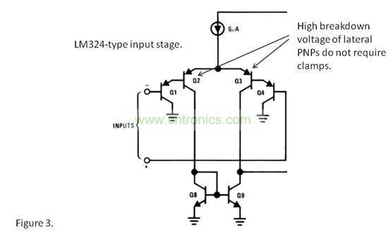 使用橫向PNP 輸入晶體管的通用運(yùn)算放大器一般沒有輸入鉗位,例如:LM324" target="_blank" title="Link to Product Folder">LM324、LM358" target="_blank" title="Link to Product Folder">LM358、OPA234" target="_blank" title="Link to Product Folder">OPA234、OPA2251" target="_blank" title="Link to Product Folder">OPA2251 和OPA244" target="_blank" title="Link to Product Folder">OPA244。這些運(yùn)算放大器一般為“單電源”類型,其意味著它們擁有一個(gè)擴(kuò)展至負(fù)電源端(或者稍低)的共模范圍。輸入偏置電流為一個(gè)負(fù)數(shù)時(shí),表示輸入偏置電流自輸入引腳流出。這時(shí),我們通常可以認(rèn)定它們?yōu)檫@類運(yùn)算放大器。但是,需要注意的是,使用PNP 輸入的高速運(yùn)算放大器一般有輸入鉗位,而這些PNP 是一些具有更低擊穿電壓的垂直PNP。