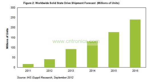 預(yù)計(jì)2013年SSD出貨量將達(dá)到9200萬(wàn)個(gè),而今年和去年分別是4100萬(wàn)和1700萬(wàn)個(gè),如圖所示。明年過(guò)后仍將強(qiáng)勁增長(zhǎng),保持兩位數(shù)的速度,直到2016年,屆時(shí)預(yù)計(jì)SSD出貨量將達(dá)到2.4億個(gè)。