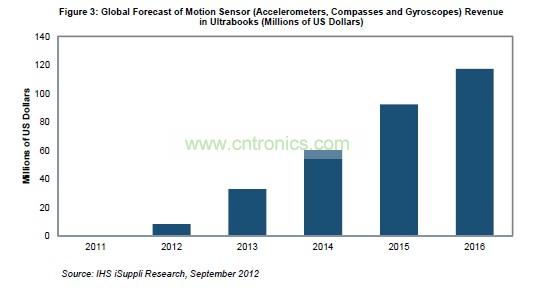 在超級本的帶動下,包括加速計、陀螺儀和羅盤在內的運動傳感器的全球銷售額到2016年將達到1.173億美元,而2012年只有830萬美元,2012-2016年的復合年度增長率高達93.9%,如圖所示。