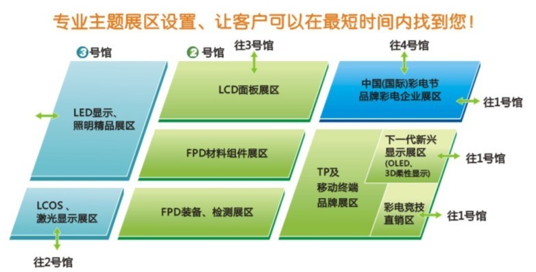 作為光電顯示行業的標志性活動,深圳光電顯示周暨中國(國際)彩電節將一如既往地覆蓋光電顯示全產業鏈,設立LCD面板展區、FPD材料組件展區、FPD裝備及檢測展區、彩電節品牌展區、彩電競技直銷展區、TP及移動終端品牌展區、下一代顯示展區等7大專區,主要展示液晶顯示、OLED、觸控、TV、3D等上中下游產業鏈最新技術與最新產品等。