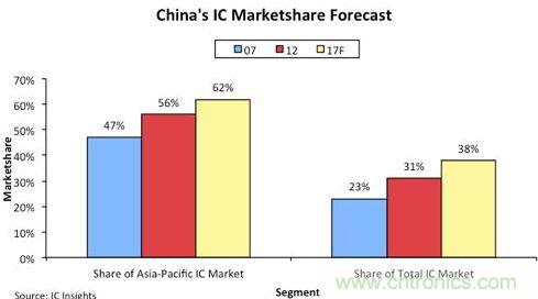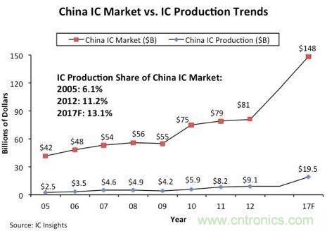 市場(chǎng)研究機(jī)構(gòu)IC Insights的最新預(yù)測(cè)報(bào)告指出,中國(guó)IC市場(chǎng)可望在2012~2017年之間,以13%的復(fù)合年平均成長(zhǎng)率(CARG)持續(xù)擴(kuò)張,報(bào)告同時(shí)指出,中國(guó)IC市場(chǎng)持續(xù)擴(kuò)張的背后,主要依靠來(lái)自外國(guó)制造商在中國(guó)地區(qū)的大規(guī)模投資建廠(chǎng)。