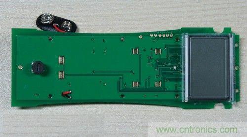 翻轉(zhuǎn)板卡,另一面的電路就更少了,除了一個(gè)段式的LCD模塊,以及幾個(gè)功能按鍵(黑色旋鈕為校準(zhǔn)溫度的變阻器),就沒(méi)什么東西了,有意思的是段式LCD模塊與PCB板的連接方式。
