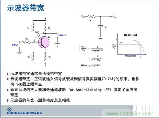 示波器的上升時(shí)間和帶寬是一一對(duì)應(yīng)的,所謂示波器的上升時(shí)間本身的指標(biāo),表示的是放大器的間接響應(yīng),就表示我對(duì)示波器趨于一個(gè)無限小、無限快的上升點(diǎn)。理論上來講,是通過高斯的函數(shù)來推導(dǎo)出0.35的關(guān)系,就是帶寬等于0.35乘以時(shí)間。因此帶寬越高,上升時(shí)間越小。這個(gè)地方也是我們?nèi)魏我粋€(gè)人參加過示波器的設(shè)計(jì)都知道的數(shù)據(jù)。實(shí)際測(cè)量的時(shí)間和正常的時(shí)間會(huì)存在這樣的一個(gè)平方和的關(guān)系,這個(gè)會(huì)產(chǎn)生接近5%的誤差。這個(gè)是非常有名的公示,這個(gè)是通過高斯來推導(dǎo)出來的。問題是我們?nèi)魏螘r(shí)候都要考慮到性價(jià)比,因?yàn)槭静ㄆ鞑皇抢硐氲膬x器,示波器本身,以及示波器的探頭,示波器本身有一個(gè)底照,探頭是一個(gè)全照,和空間輻射耦合的方式,會(huì)感應(yīng)很多的噪聲,當(dāng)示波器和探頭感應(yīng)了噪聲信號(hào)的能量遠(yuǎn)遠(yuǎn)大于真正的被測(cè)的信號(hào)能量的時(shí)候,這個(gè)時(shí)候性價(jià)比太小,帶寬越高,測(cè)的結(jié)果越差。這個(gè)就是很多公司代代相傳告訴帶寬要限制20兆的原因。測(cè)量一個(gè)3.15G的波形信號(hào)的時(shí)候,也是用這個(gè),就是這個(gè)道理。因?yàn)槲覀冎廊魏我粋€(gè)信號(hào)都可以分解成N次諧波的疊加。所以我們看這個(gè)N等于多少的時(shí)候,你的帶寬可以覆蓋你信號(hào)能量的99.99%,當(dāng)示波器的帶寬已經(jīng)可以覆蓋99.99%的時(shí)候,你非要更高的帶寬,這個(gè)時(shí)候就得不償失了。因?yàn)槲艺f了,當(dāng)示波器本身的噪聲遠(yuǎn)遠(yuǎn)高于信號(hào)能量的時(shí)候,要注意這一點(diǎn)。所以帶寬并不是越高越好。