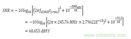 現在,通過計算得到了所有必須的要素,但依然缺少最后一個公式。 需要計算此抖動對AD9643的SNR產生的影響。 現在來看看這個公式是什么,然后代入已知數。已知時鐘頻率和rms抖動。 從AD9643數據手冊中可以得到140 MHz模擬輸入頻率下的SNR等于71.4 dBFS。 使用公式,可以看到結果為: