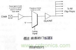 這 是最廣泛使用的方法,即在器件末使用時截斷時鐘來降低功耗。然而正確地截斷時鐘十分重要。門控信號與門控邏輯應(yīng)正確地設(shè)計(jì),以消除時鐘線上的任何毛刺。再 者,門控邏輯會增加時鐘的延時,影響建立時間與保持時間。由于抗熔斷是一種極快速的技術(shù),引入的延時很小且容易控制。在使用時鐘門控時,用戶應(yīng)仔細(xì)地安置 門控邏輯,將時鐘網(wǎng)絡(luò)的延時降低到最小限度。典型的門控邏輯如圖3所示。