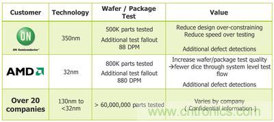 事實證明,單元識別 ATPG 測試法是唯一可以發現傳統方法檢測不出的缺陷的方法。它可以發現一套完整的針對固定故障、節點跳變和時延缺陷的測試方法發現不了的缺陷,因為這種方法首先就對標準單元進行物理布局時可能出現的實際缺陷進行模擬。在新技術的改進下,單元識別測試法中的測試向量大小得以縮小,但整個測試向量仍大于傳統的測試方法產生的測試向量,因此要進行嵌入式壓縮。許多公司因為采用單元識別測試法而收效顯著。部分成效的概述請見圖1。