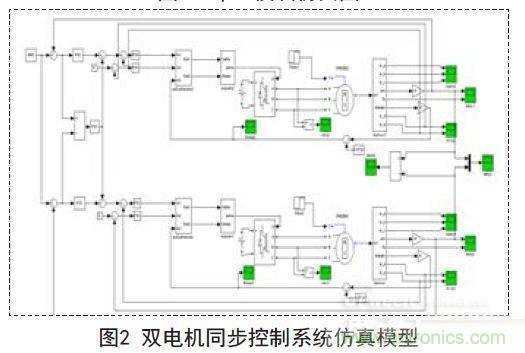 PlD控制有很強(qiáng)的生命力,它對于大多數(shù)過程都具有良好的控制效果和魯棒性,而且算法原理簡明,參數(shù)物理意義明確,理論分析體系完整且應(yīng)用經(jīng)驗(yàn)豐富。因此針對系統(tǒng)中的抑制干擾特性這一方面的要求可以采用PID控制器。對單電機(jī)的控制采用雙閉環(huán)設(shè)計,通過svpwm進(jìn)行調(diào)速,使系統(tǒng)具有良好的穩(wěn)定性,svpwm調(diào)速模塊仿真圖如圖1所示。然后將兩臺電機(jī)反饋回來的轉(zhuǎn)速差作差,再通過PID調(diào)節(jié)作為當(dāng)負(fù)載有變化時的轉(zhuǎn)速反饋額外補(bǔ)償。系統(tǒng)仿真模型如圖2所示。