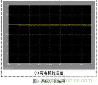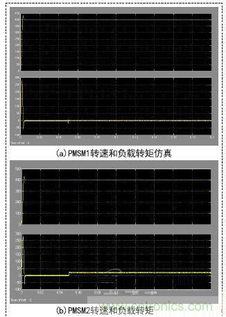 將電機(jī)轉(zhuǎn)速設(shè)定為400r/min,讓電機(jī)進(jìn)行零負(fù)載啟動。設(shè)定仿真時間為0.2s,為了驗(yàn)證負(fù)載改變對系統(tǒng)產(chǎn)生的影響和雙電機(jī)的跟隨性能,在t=0.05s時,給PMSM2突加一個TM=20N·m的負(fù)載轉(zhuǎn)矩。仿真圖形如圖3所示。