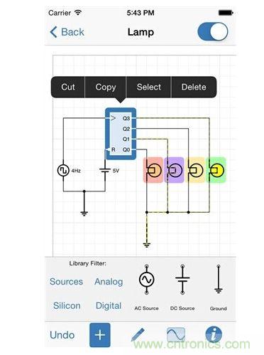 《電子電路仿真和設計 iCircuit》是首屈一指的電路設計和試驗應用程序,功能非常強大,這是學生,業(yè)余愛好者和工程師的完美伴侶。其先進的模擬引擎可以處理模擬和數(shù)字電 路和實時分析的功能 。只要您會任何CAD程序,您就可以使用它:添加元素,它們連接在一起,并設置其屬性,但iCircuit不像其他CAD程序,因為它始終是模擬。這就像 與實際電路的工作 。你不停止進行測量,或花很多時間配置。雖然這個只是玩玩,但他像真實的電路一樣!有超過30種元件,你可以用它來構(gòu)建電路。從簡單的電阻,開關(guān),晶體 管,數(shù)字門。您還可以模擬探頭檢測周圍的電路,有即時讀取電壓和電流的萬用表。如果你想看經(jīng)過一段時間數(shù)值是如何變化的,那么你可以使用內(nèi)置示波器。