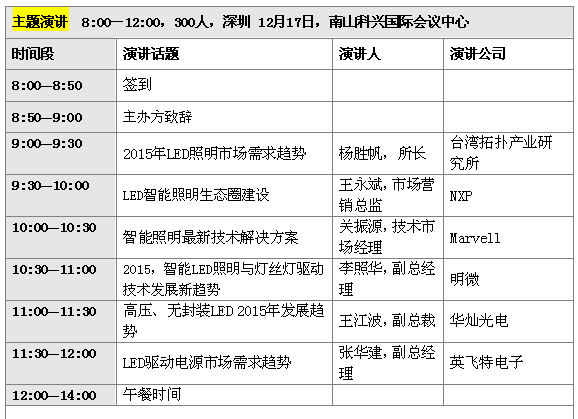 《第三屆華強國際LED照明前瞻技術研討會》將于2014年12月17日(周三)在廣東省深圳市科技園科興國際會議中心3樓舉行,屆時臺灣拓撲產業研究所所長楊勝帆、NXP市場營銷總監王永斌、Marvell技術市場經理關振源、明微電子副總經理李照華、昂寶副總裁高維、昂帕董事長桑鈞晟博士、英飛特電子副總經理張華建、華燦光電副總裁王江波、聚元微電子總經理韓興成、綠寶石技術總監伍松、中昊光電總經理王孟源、華燦光電副總裁王江波、清華大學副研究員錢可元將親自前來與您共同探討2015年LED照明市場的新需求、新變化和新趨勢,精彩就在眼前,期待您也能撥冗前來共襄這一LED照明行業全明星盛會。