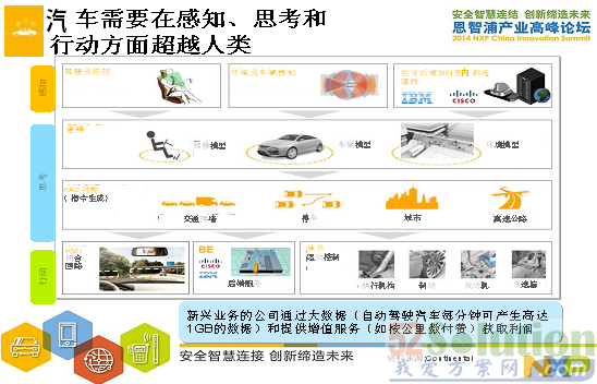 汽車在未來會更加緊密地相互連接,會有更多的信息通過車與車之間,或者是車與其他的設施和周邊的設施之間進行交換,也就意味著我們的車子要連接到云當中。NXP的安全互聯方案可以確保信息傳輸的安全性。