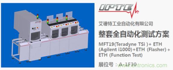 SMT后端是全自動化發展重點,2015年NEPCON China中國電子展,IPTE將現場演繹精彩的全自動化方案,推出全自動測試線 BTR+ IPTE MFT19’(泰瑞達TSi )+ IPTE ETH(安捷輪i1000)+ IPTE ETH(燒錄器)+ IPTE ETH(功能測試) +BTR),其中串聯3臺ETH 配置為雙層軌道,將全新演示快捷而安全的無縫連接測試方案,讓所有的測試瓶頸和人為干涉成為歷史。IPTE提供的整套全自動化解決方案,得以幫助電子和機械制造業實現真正的全自動生產和測試,將顯著提高客戶產品的產量和質量。IPTE產線在展會現場的演示時間為每天上午10:30分和下午2:30分,熱忱歡迎新老客戶光臨展臺A-1F30。