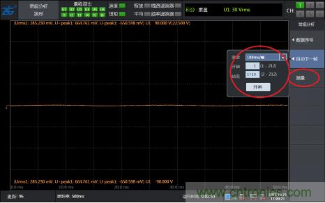 第三步,點擊圖 3菜單中“測量”區域,使界面出現“測量”字樣,此時儀器界面中的波形會停止刷新。然后通過“自動下一幀”菜單,選擇要查看的波形幀數,可以選擇從第一幀開始,到最后一幀介紹,然后設定每一幀的回放速度(從人眼的反應考慮,建議選擇200ms/幀以上),點擊開始之后,界面中的波形會進行回放,當看到想要看的波形后按停止按鍵,然后通過“數據序號”來調整波形,確保看到自己想要的波形,如圖 4所示;