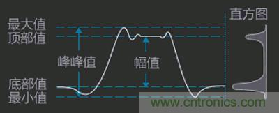 2.自動測量,當示波器正確捕獲波形后,示波器可以對波形參數進行自動測量。自動測量需要參考點,一般稱為Vtop(頂部值) 和Vbase(底部值),參考點的測量采用幅度統計方法。示波器的工作過程是對捕獲波形進行的幅度分析,先確定最大值Max和最小值Min,然后對最小電壓上的40%和最大電壓下的40%進行分析,然后進行累積概率統計,出現概率最大的值為Vtop 和Vbase。不用統計中間20%部分,防止被測波形是3態信號得出錯誤結果。